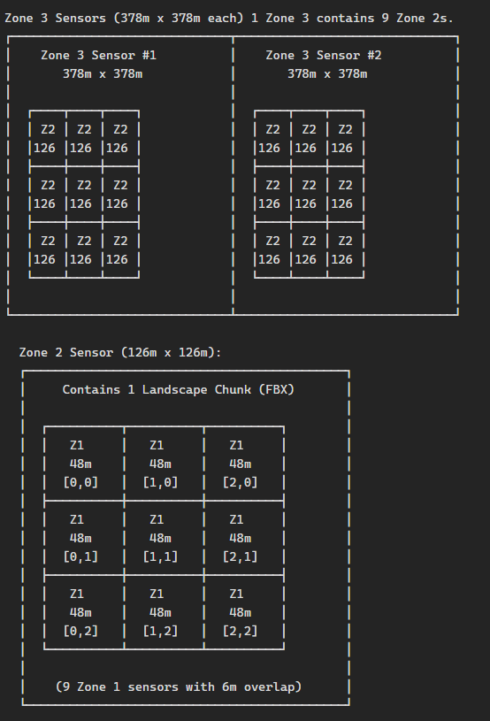 The first step was splitting my map into more finer grained zones. We are exporting UE5’s landscapes which breaks the map into 126×126 meter meshes. Previously, I was creating two sensors per 126x126m chunk. One for a “local” sensor that was the same size as the 126x126m chunk, and another that spanned 3×3 of those.